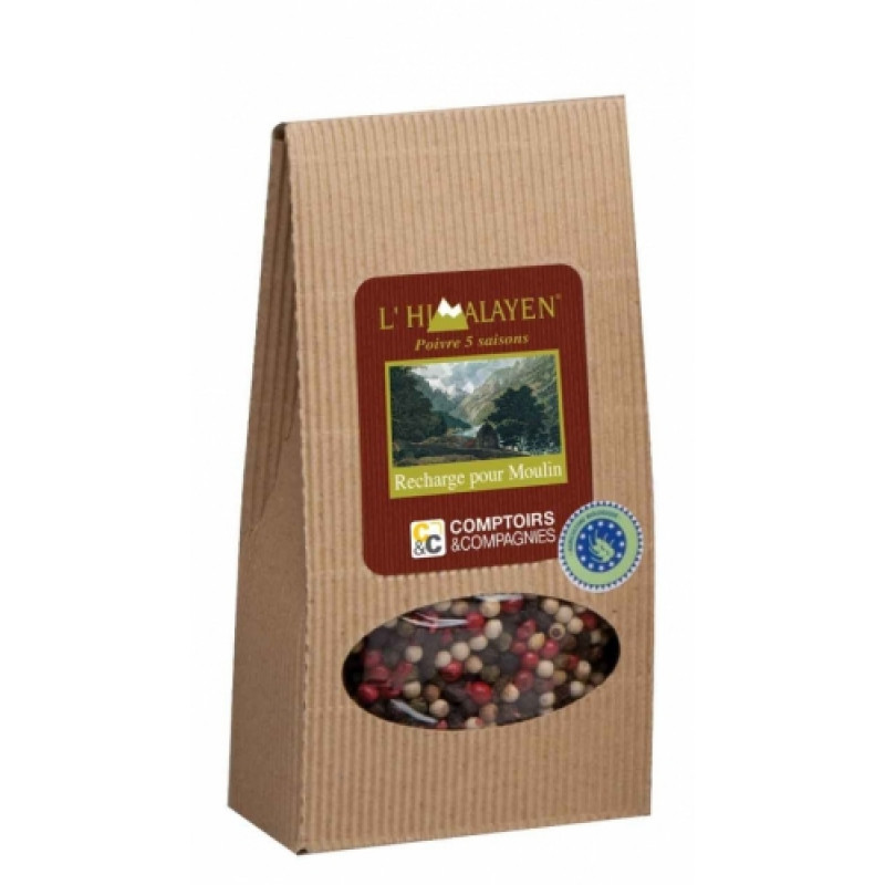 Poivre bio 5 saisons, issus de l’agriculture biologique : le Poivre Vert, plus fruité que fort, le Poivre Blanc, le plus piquant, le Poivre Noir, très aromatique et la Baie Rose, douce presque sucrée. Par la magie d’un tour de moulin, il réveille la saveur de nos assiettes.